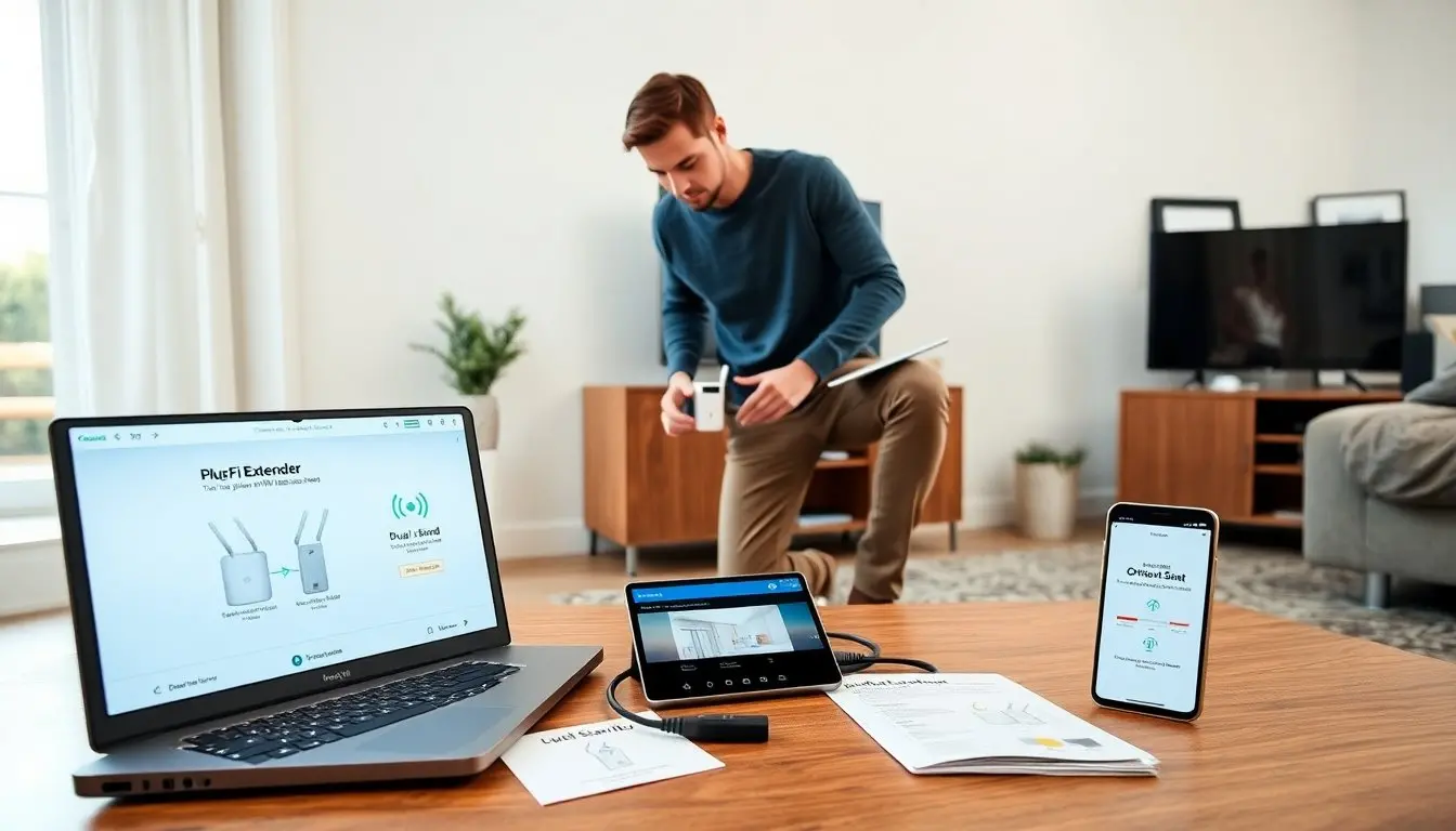 Prepare devices. The user charges or powers devices that will connect after setup. They clear temporary Wi‑Fi profiles on a test phone or laptop to avoid confusion. They note whether they want the extender to use the same SSID or a new SSID for the extended network.