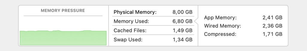 - Memory — If the Memory Pressure graph is always yellow or red, your system is struggling to keep up with RAM demands.